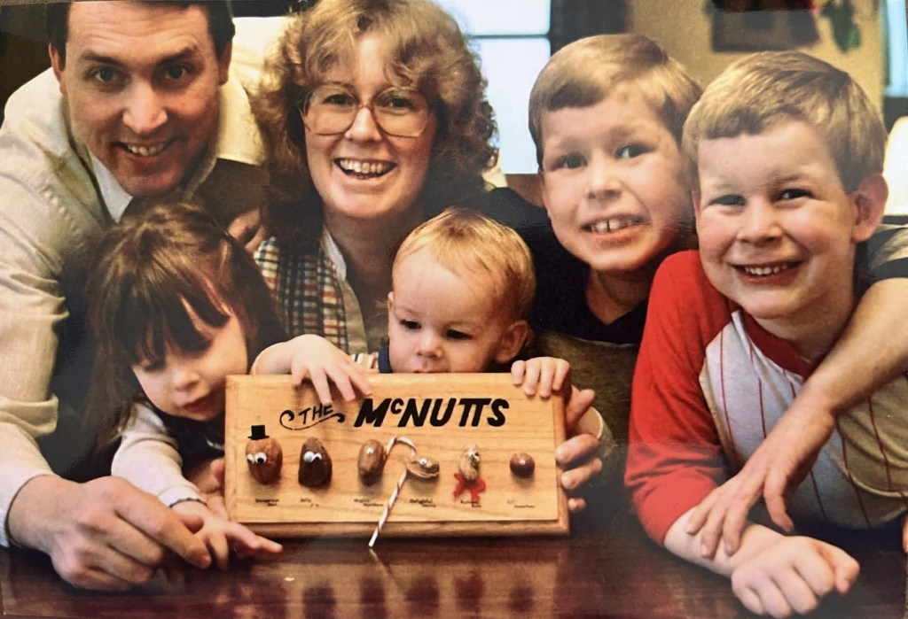 I was really excited to speak with Dr. McNutt after reading her beautiful, pastoral book, which was gifted to me from my brother, Rev. Dr. Matthew McNutt. It’s always fun to meet another McNutt doing good work out in the world! Here’s that adorable picture of my family with our nut shell sign my dad made; I’m guessing this is 1983 or 1984: