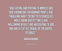 Often I have been asked, “Brennan, how is it possible that you became an alcoholic after you got saved?” It is possible because I got battered and bruised by loneliness and failure; because I got discouraged, uncertain, guilt-ridden, and took my eyes off Jesus. Because the Christ-encounter did not transfigure me into an angel. Because justification by grace through faith means I have been set in right relationship with God, not made the equivalent of a patient etherized on a table” (pgs. 30-31).